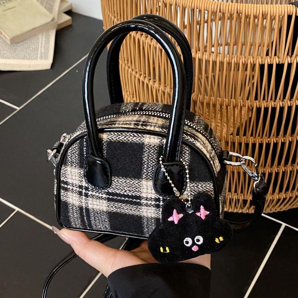 French Style Boston Shoulder Bag Cloth Women Handbags Trendy Woolen Plaid Bowling Bag Girls