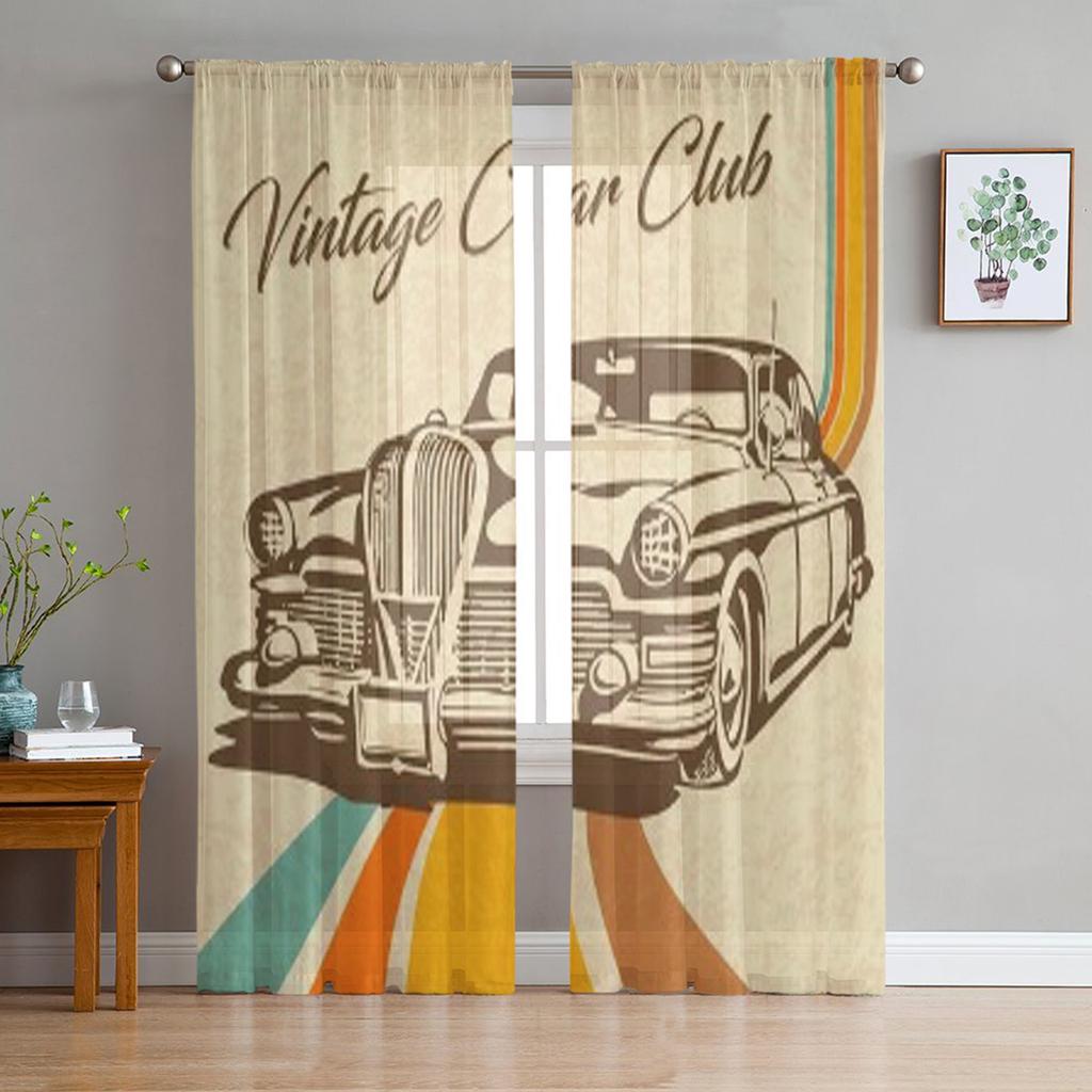 Vintage Car On Retro Sheer Curtains for Living Room Transparent Tulle Window Treatments Bedroom Kitchen Home Decor Veil Drapes