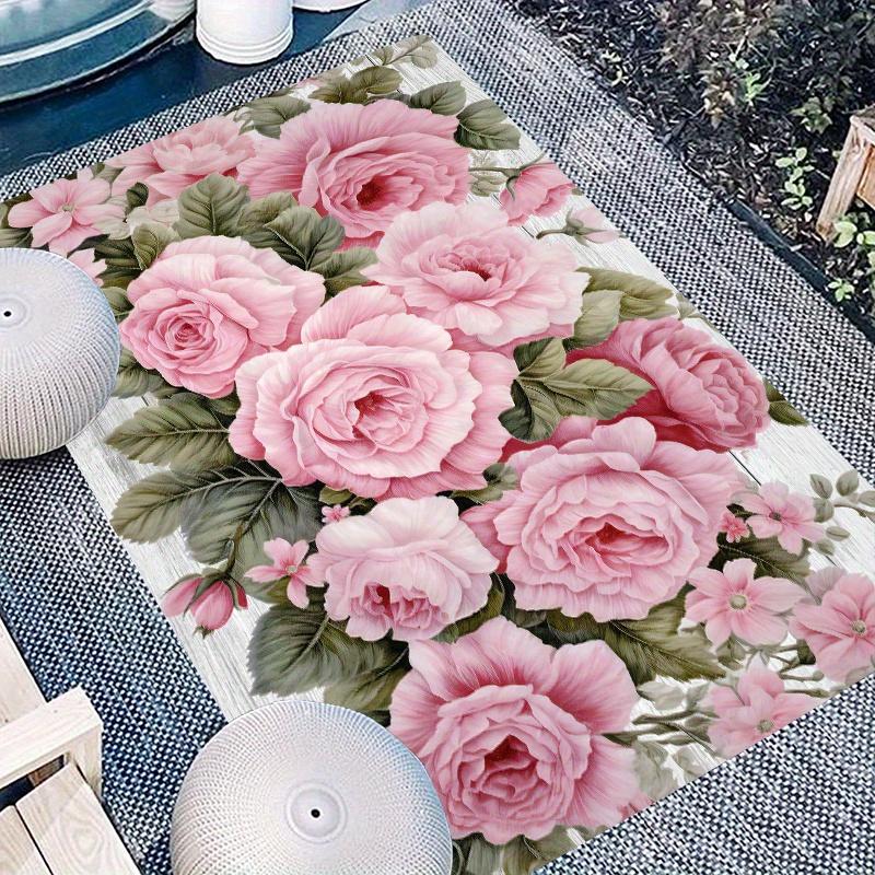 1Pcs Pink Floral Pattern Floor Mat Modern Kitchen Polyester Rug Non-Slip Colorful Indoor Carpet, For Home Bathroom Bedroom Living Room Decor