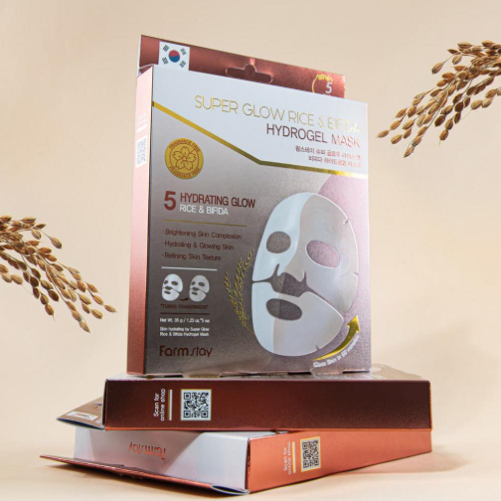 Farmstay Super Glow Rice & Bifida Hydrogel Mask 5-Sheet Box – Brightening & Strengthening Facial Masks