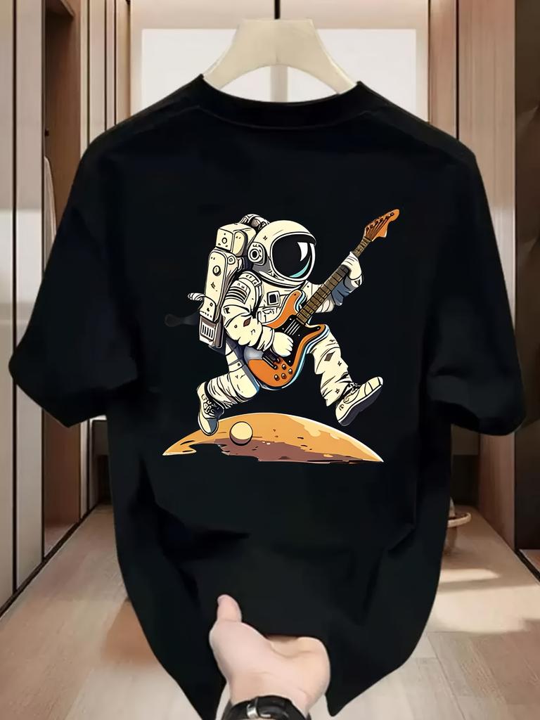 Men Cotton Graphic T-Shirt Astronaut Playing Guitar On Moon Print Casual Round Neck Short Sleeve Summer Tee Men Clothing