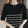 Striped Round Neck Knitted T-shirt for Women In Summer Contrasting Color Loose and Versatile Outside Wear Slim Ice Silk Knitted Short Sleeves