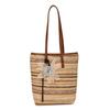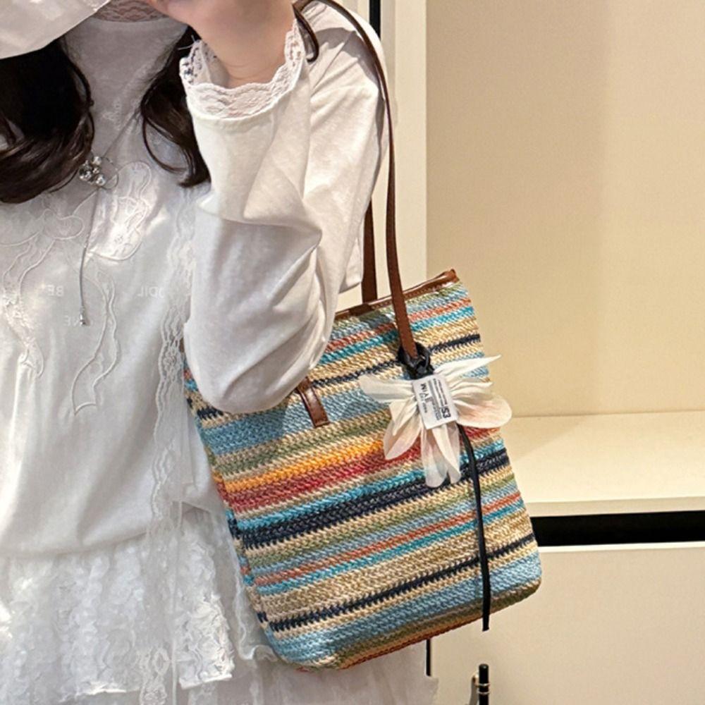 Bohemian Style Rainbow Woven Handbag with Flower Pendant Summer Bucket Bag Shopping