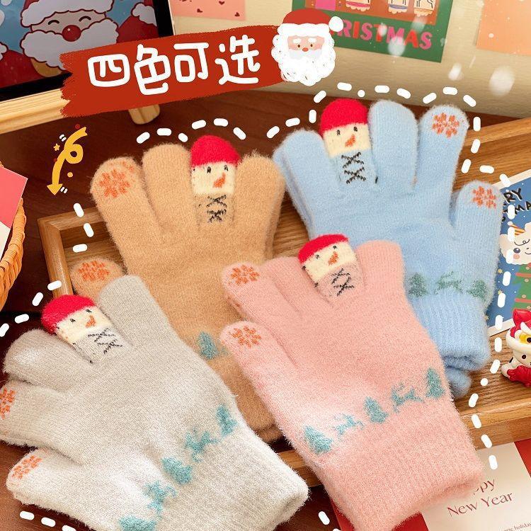 Winter Thermal Gloves Female Plush Cartoon Cute Christmas Snowman Five Fingers Can Touch the Screen Student Knitting