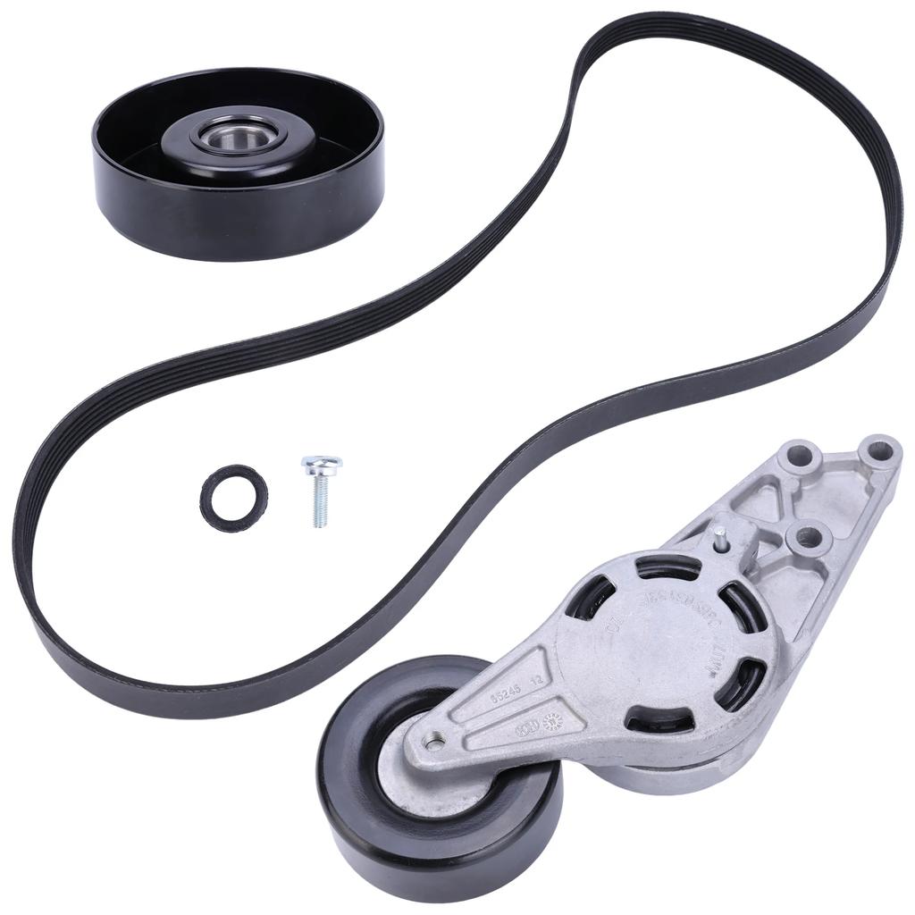 Function: the serpentine belt can transmit power to the engine accessories, and the tensioner can provide the necessary belt tension for the system, control vibration, reduce noise and prong the belt service life. The idler pulley can help enhance drivetrain stability.