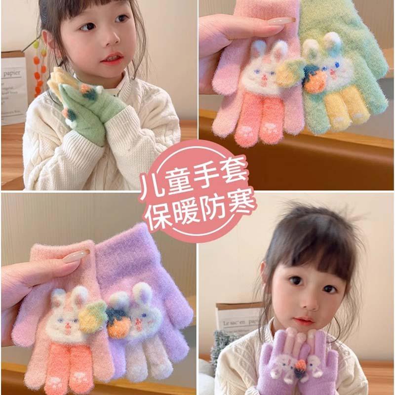 Children's Gloves Autumn and Winter Men's and Women's Plush Thickened Warm Finger Children's Color Cartoon Rabbit Outdoor Play
