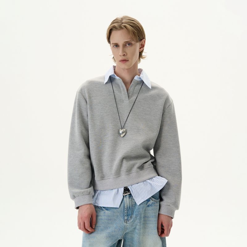 Kisko American-Style High-Fashion Two-Piece Spliced V-Neck Gray Sweatshirt for Men and Women, Niche Design, Loose Casual Top