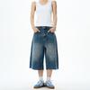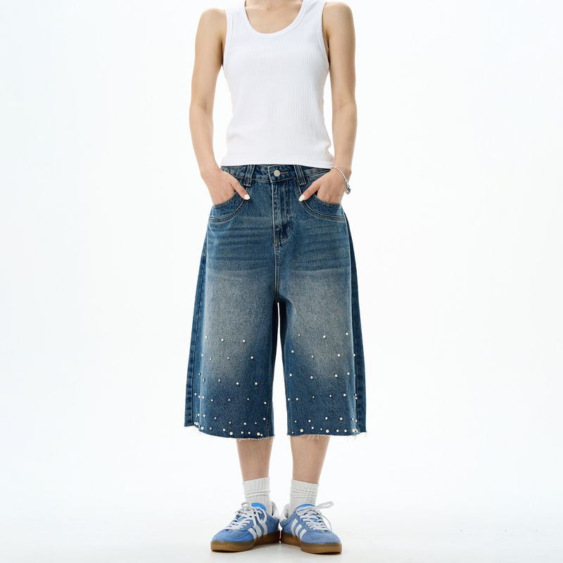 Summer American-Style Beaded Washed Distressed Raw Hem Denim Shorts for Men and Women, Loose Straight-Leg Mid-Length Pants with a Sense of Design