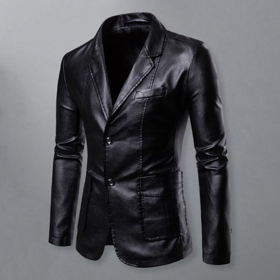 Men Solid Color Faux Leather Suit Coat Lapel Long Sleeve Pockets Single-breasted Business
