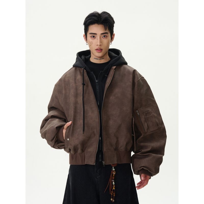Kisko American Retro Bomber Faux Two-Piece Oversized Jacket for Men and Women Vibe Thickened Hooded Cotton Coat Trendy
