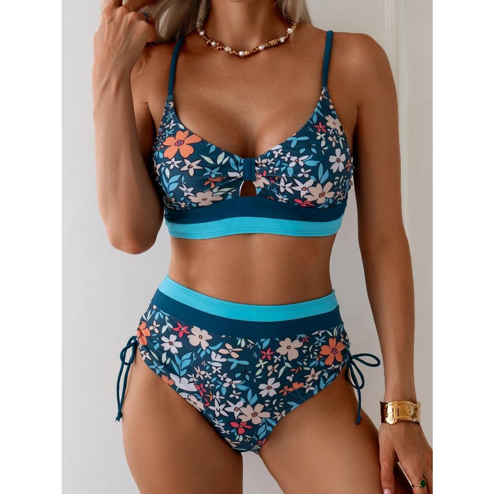Vintage Blue Floral Print Bikini Women Hollow Out Push Up Drawstring Side High Waist Swimsuit 2026 Beach Bathing Suit Swimwear