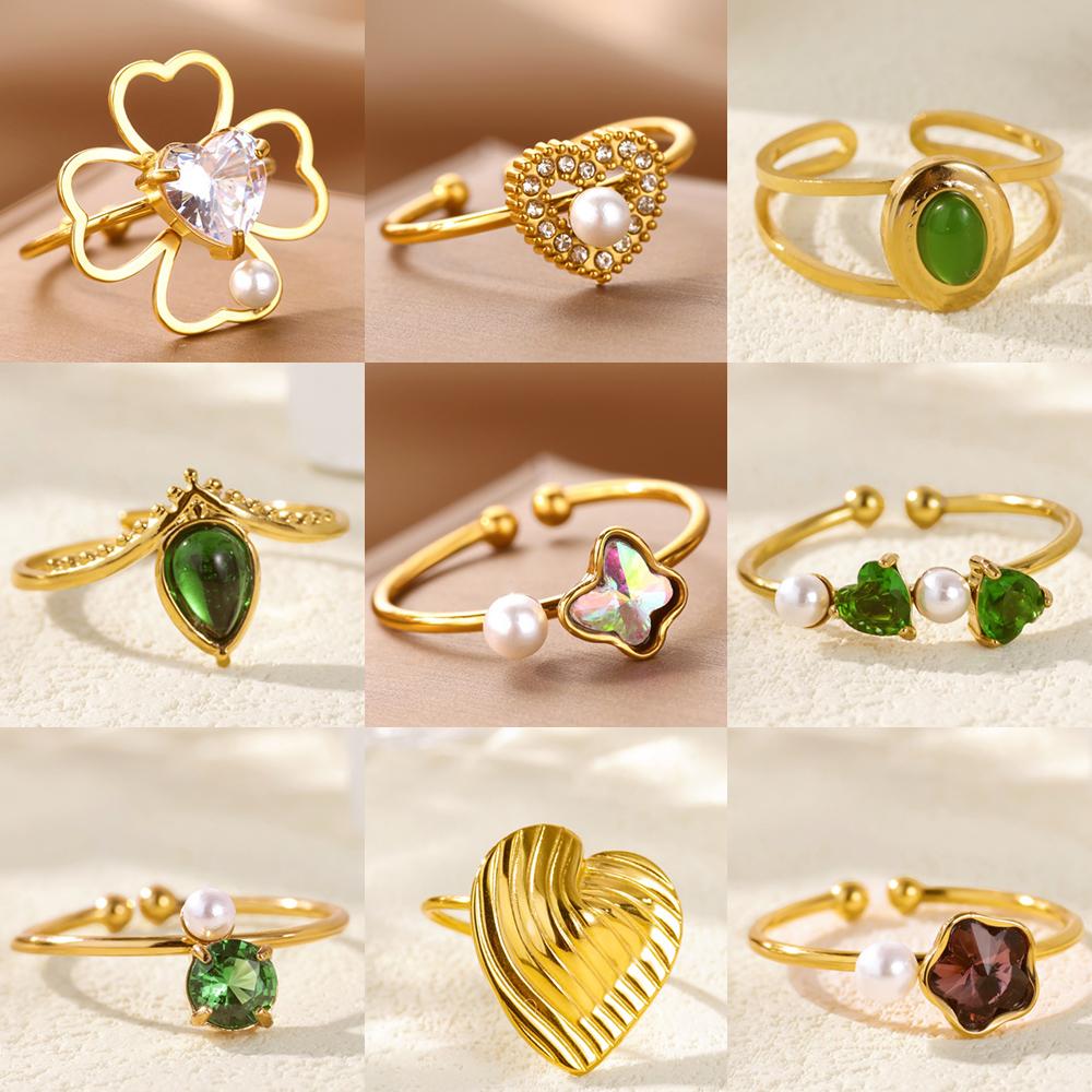 Zircon Four Leaf Clover Rings For Women Gold Color Stainless Steel Opening Couple Ring Aesthetic Wedding Bohemian Jewelry Gift