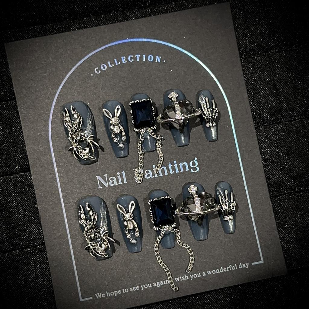 Medium Coffin Press On Nails Square Fake Nails French Tip Glue On Nail with 3D Designs Reusable False Acrylic Nails Full Cover Stick On Nail for Women