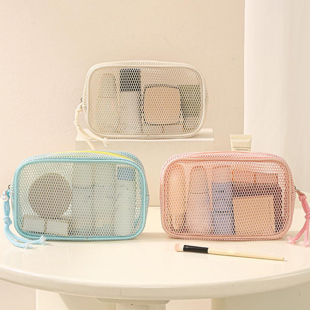 This versatile cosmetic bag features a durable, wear-resistant mesh material designed for long-term use. Its breathable, waterproof fabric ensures lightweight yet sturdy protection for your essentials. The see-through mesh design allows quick visibility of contents, saving you time when searching for items.