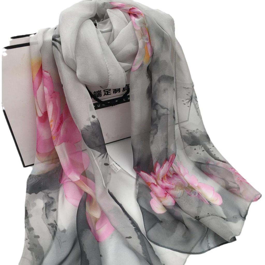 Lotus Ink Wash Fashion Gauze Scarf - Georgette Chiffon Silk Long Shawl for Summer Sun Protection