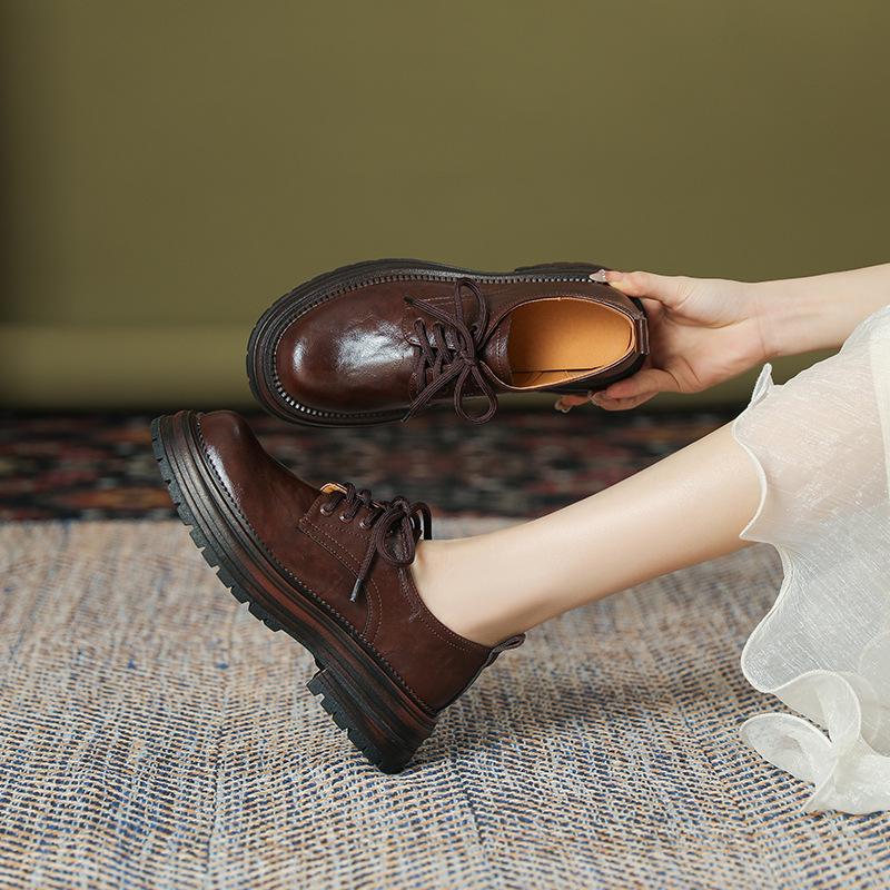 Women's 2024 Spring/Summer Retro Lace-Up Loafers - Thick Sole, Round Toe, Chunky Heel In British Style
