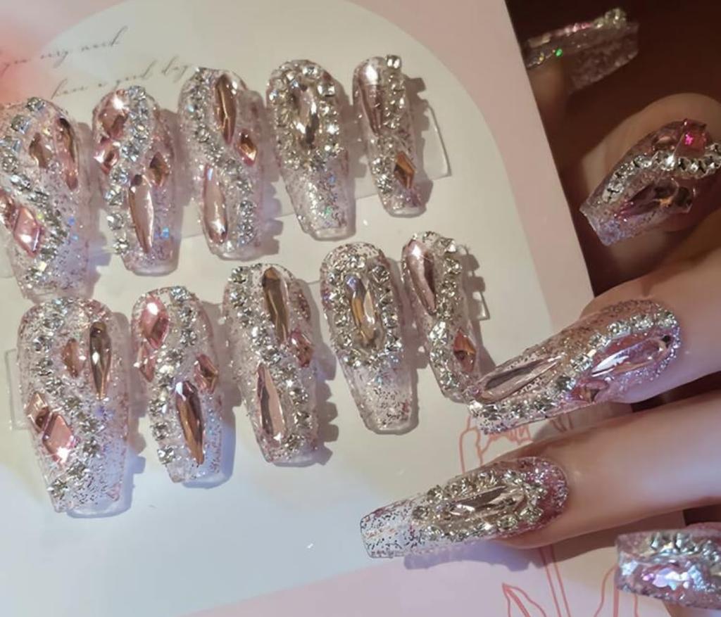 Y2K Glamorous Press-On Nails, Pink Gold Crystal Decoration, Long Coffin Shape, with Rhinestones, Nail File and Gel Adhesive Set
