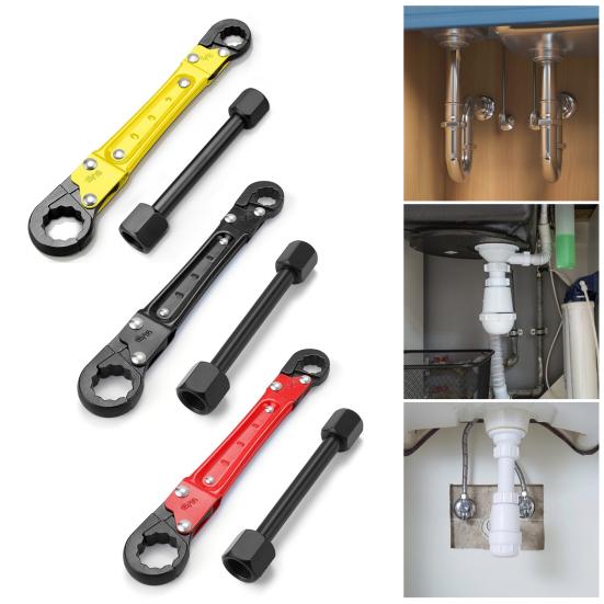 This 2-in-1 Plumber wrench offers enhanced grip and torque with its innovative double-acting mechanism. Its adjustable design caters to 15/16 and 5/8 nuts, while the threaded ends are compatible with 3/8 or 1/2 MPT compression outlet threads at angle stops. Ideal for pipe tool and valve repairs, this wrench maximizes productivity with its ergonomic design and self-adjusting jaws that securely fit across various sizes.