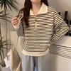 Black Striped Polo Neck Front Shoulder Sweater Women's Autumn New Loose Half Zipper Casual Style