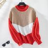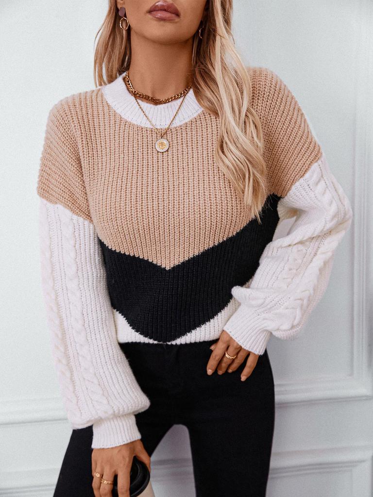 Color Block Cable Knit Crew Neck Pullover Sweater - Women's Autumn/Winter Loose Fit Knitwear