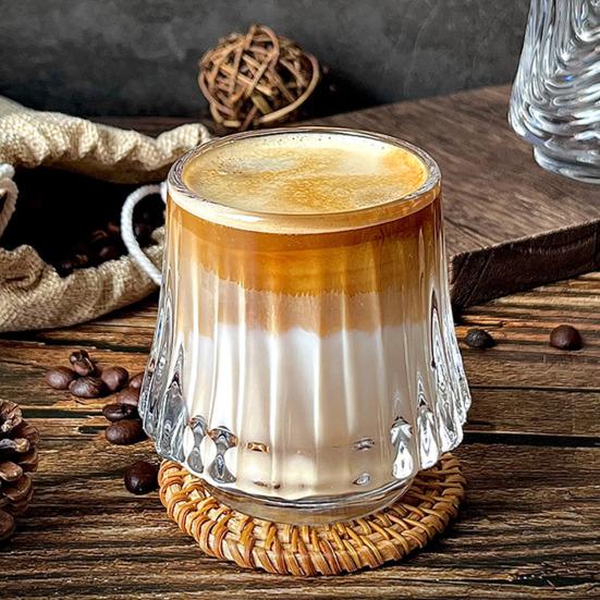 Designed to withstand temperature changes, it safely holds both hot and cold beverages without cracking. The elegant vertical embossed pattern adds a sophisticated texture that enhances the visual appeal of layered drinks, making it ideal for trendy coffee creations.