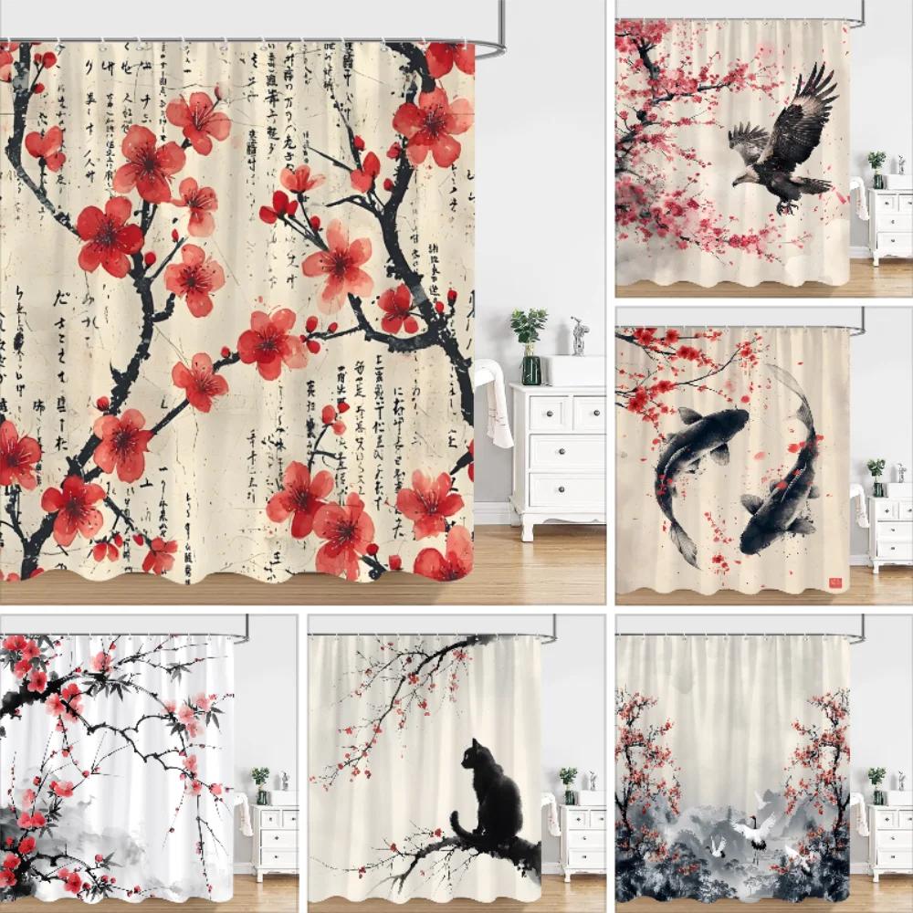 Chinese Japanese Ink Painting Shower Curtain Red Plum Blossom Art Painting Retro Style Polyester Shower Curtains Bathroom Decor
