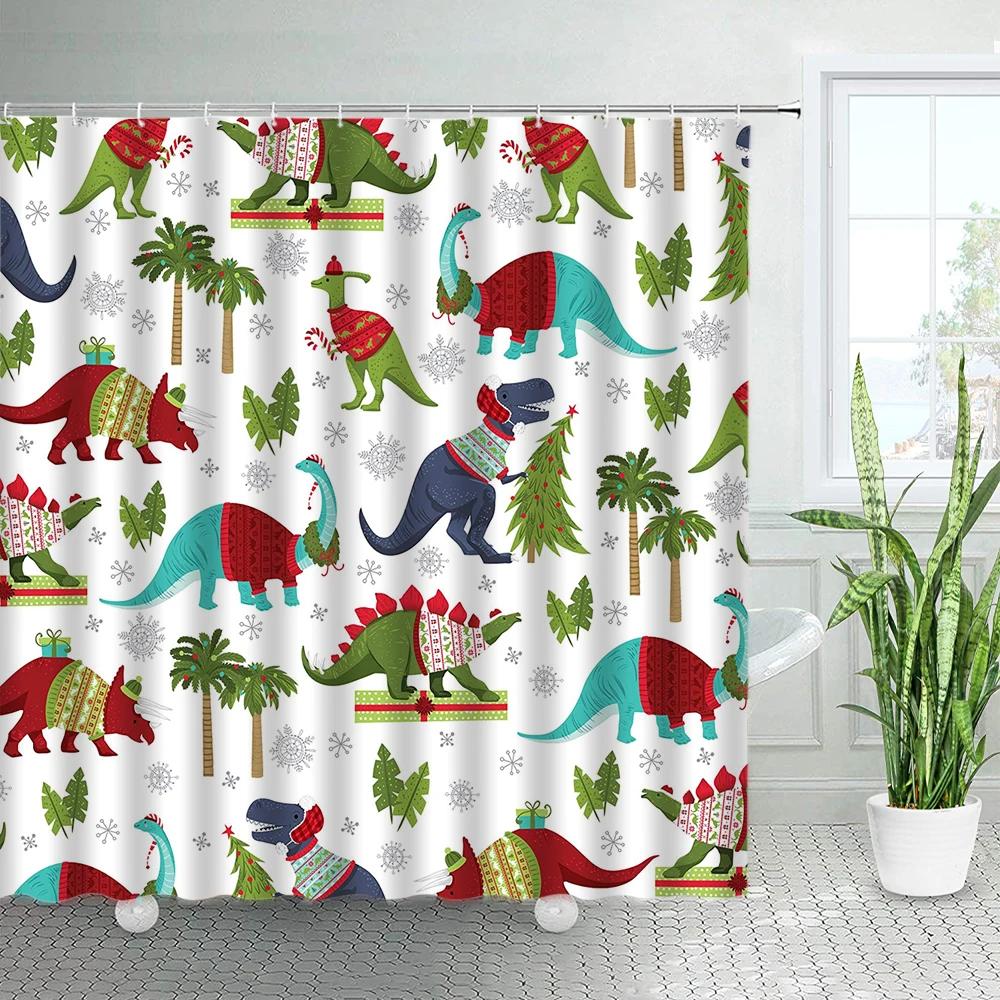 GAECartoon Christmas Dinosaurs Shower Curtains Green Tropical Coconut Palm Tree Leaves Xmas Bath Curtain Cloth Bathroom Decor
