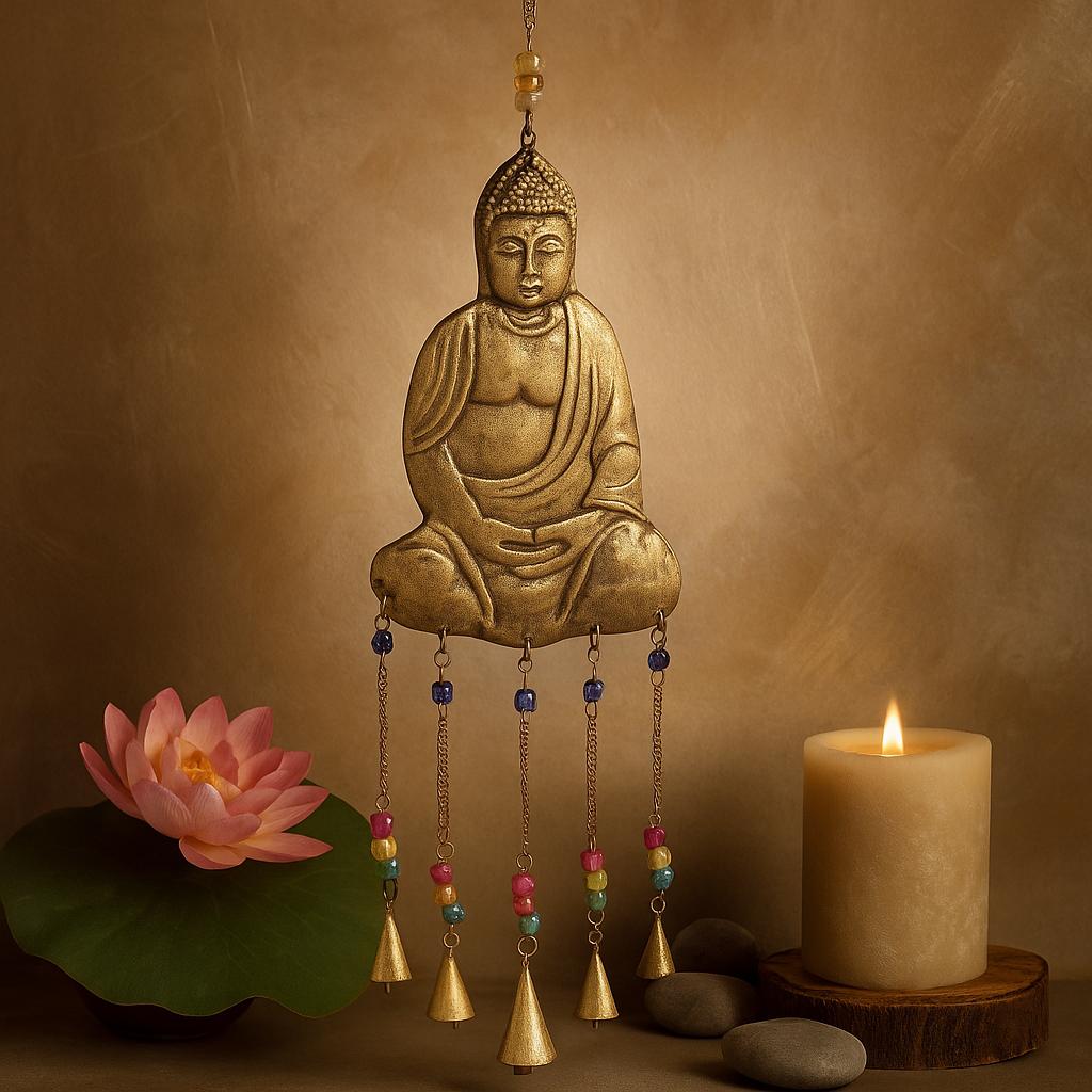 The cool gleam of brass, a seated Buddha held in quiet poise, and five small bells that stir with the lightest breeze. Jewel-toned beads catch the light as a clear, gentle melody moves through the room — a soft reminder of balance, presence, and the subtle currents that flow through every space. 🌬️🔔