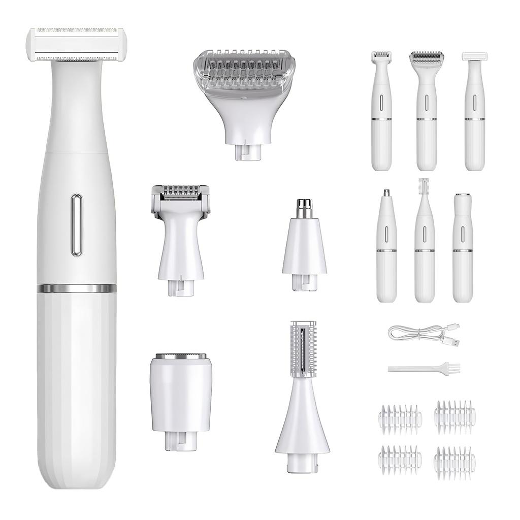 Six interchangeable heads for optimal care for each area: This electric shaver for women comes with six attachments: a T-shaped trimmer, an eyebrow head, a chin trimmer, a short hair blade, a nose hair trimmer, and a large full-body head, allowing you to meet any hair removal need. Each head features rounded corners that come into contact with the skin, making it safe for sensitive skin. When used as a face shaver, it's especially versatile, allowing for delicate tasks from shaving the pubic area to shaping eyebrows.