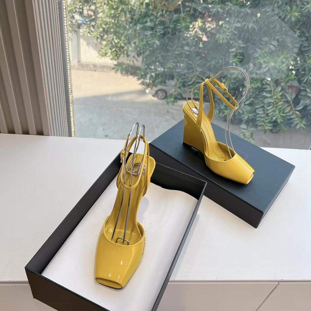 Fashion 2025 Unique Design Square-Toed Patent Leather High-Heeled Chunk-Heeled Women'S Shoes Wedge Heel Fish-Mouth Sandals