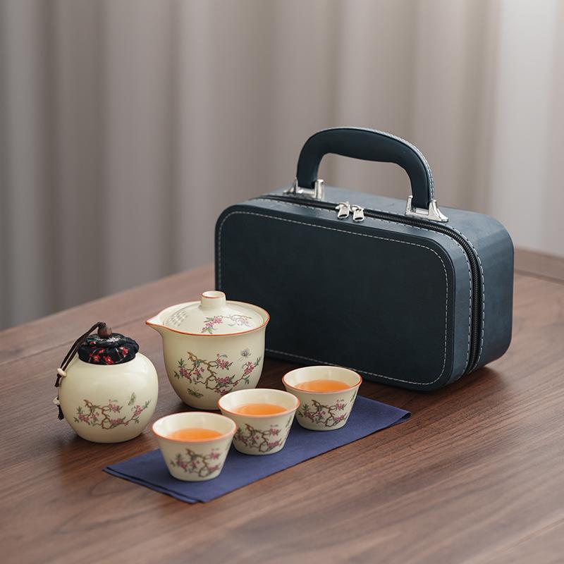 Ru Kiln Travel Tea Set Outdoor Portable Ceramic Fast Cup with Teapot Teapot Tea Can Leather Bag Business Gift