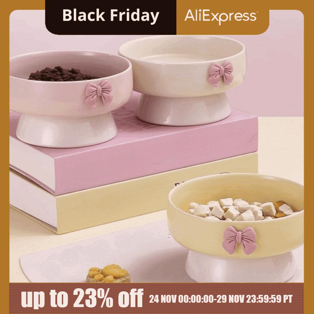 Large Capacity Ceramic Cat Bowl Macaron Colors Non-Slip Base Elevated Pet Bowl with Bow Pet Feeding Bowl Pet Feeding Drinking
