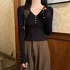 V-neck Button Design Temperament Sweater for Women AutumnNew Korean Style Slim Short Long-sleeved Top