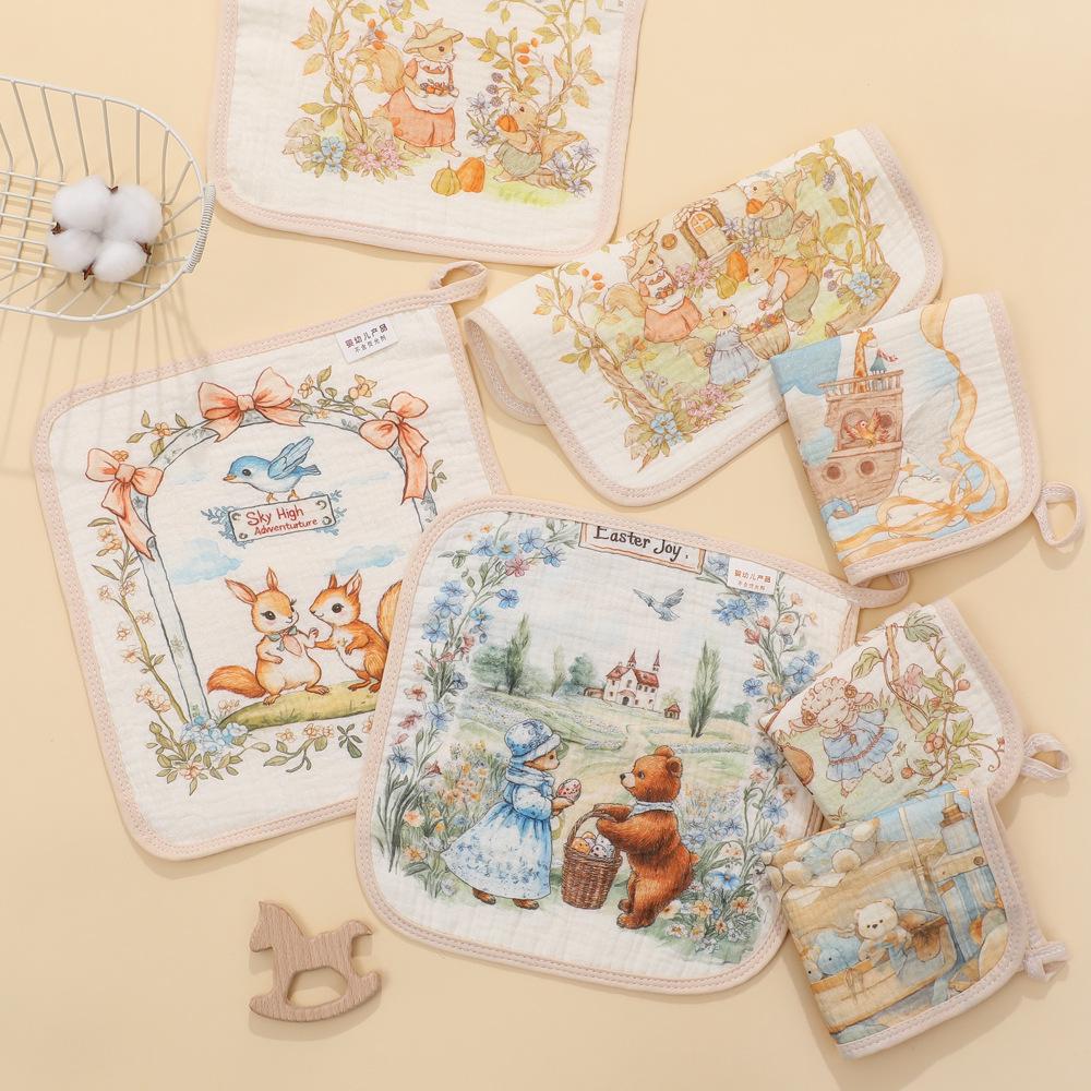 Four-Layer Gauze Cartoon Baby Towel: Absorbent Kindergarten Bib and Handkerchief.