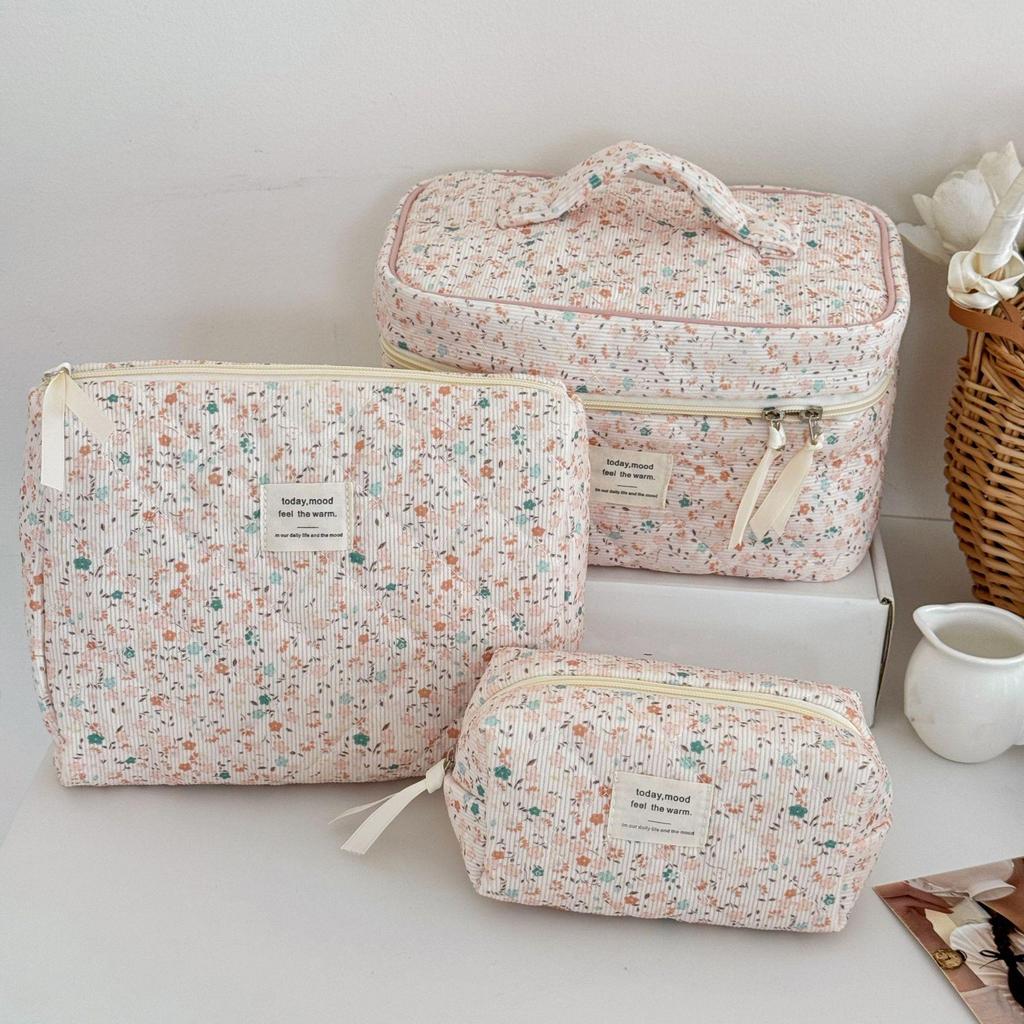Vintage Floral Corduroy Makeup Bag - Large Capacity, Portable Cosmetic Storage Clutch
