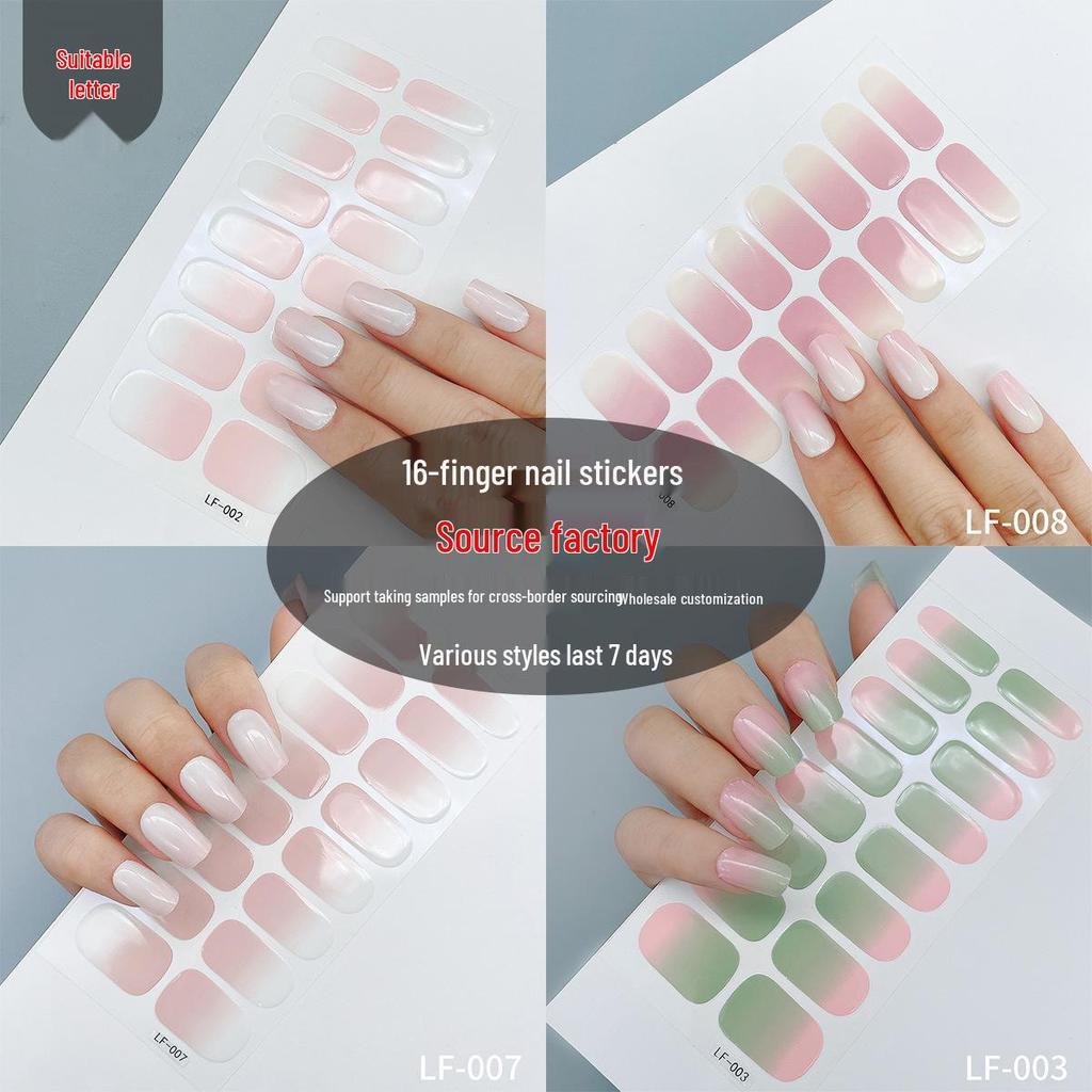 Experience a lasting, salon-quality manicure in minutes with these innovative no-bake waterproof gel nail stickers. Designed for ultimate convenience, these stickers offer a diverse collection of styles, including solid colors, sparkling glitter, chic color blocks, and elegant gradient designs. Each full-cover sticker ensures a perfect fit and a flawless finish, providing a vibrant, long-lasting look without the need for UV lamps or drying time. Ideal for any occasion, these gel nail stickers are easy to apply and remove, allowing you to effortlessly switch up your style whenever you desire.