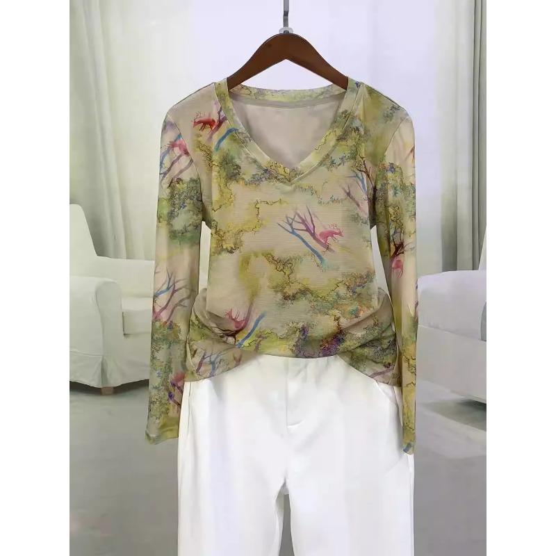Long-sleeved Printed Double-layered Mesh Top for Women Autumn New Popular Pullover V-neck Top