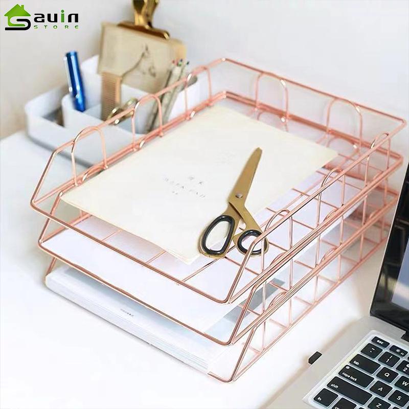 Nordic Magazine Newspaper Organizer Metal Stackable Storage Basket Frame Rack Office Desktop Rose Gold A4 Paper Finishing Basket