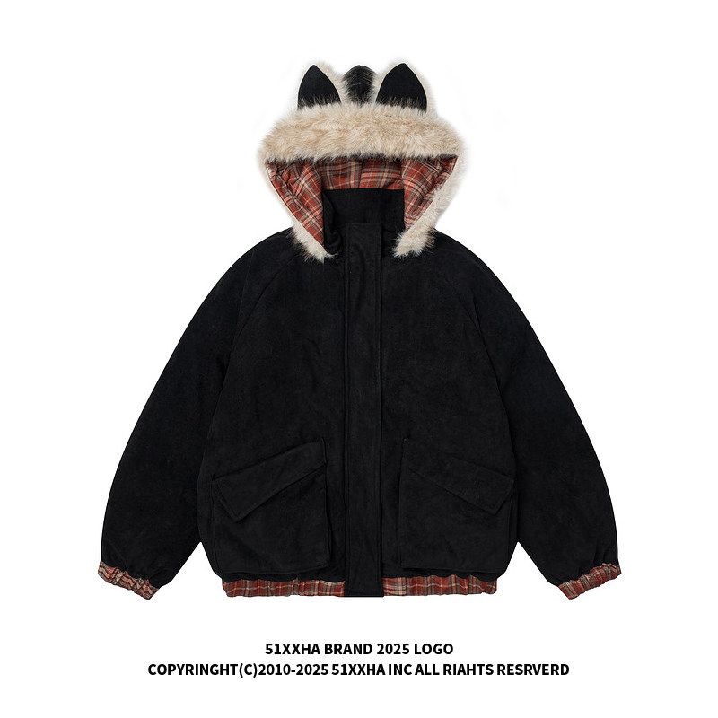 51 Hip-Hop Trendy Brand Retro Suede Cat Ear Hooded Cotton Jacket for Men, Winter Thickened American-Style Fur Collar Padded Cotton Coat