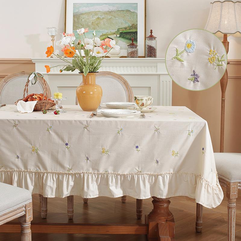 Light Luxury Cotton Apricot Embroidered Plant Flower And Grass Skirt Pleated Lotus Leaf Edge Round Coffee Table Tablecloth Dining Table Cloth