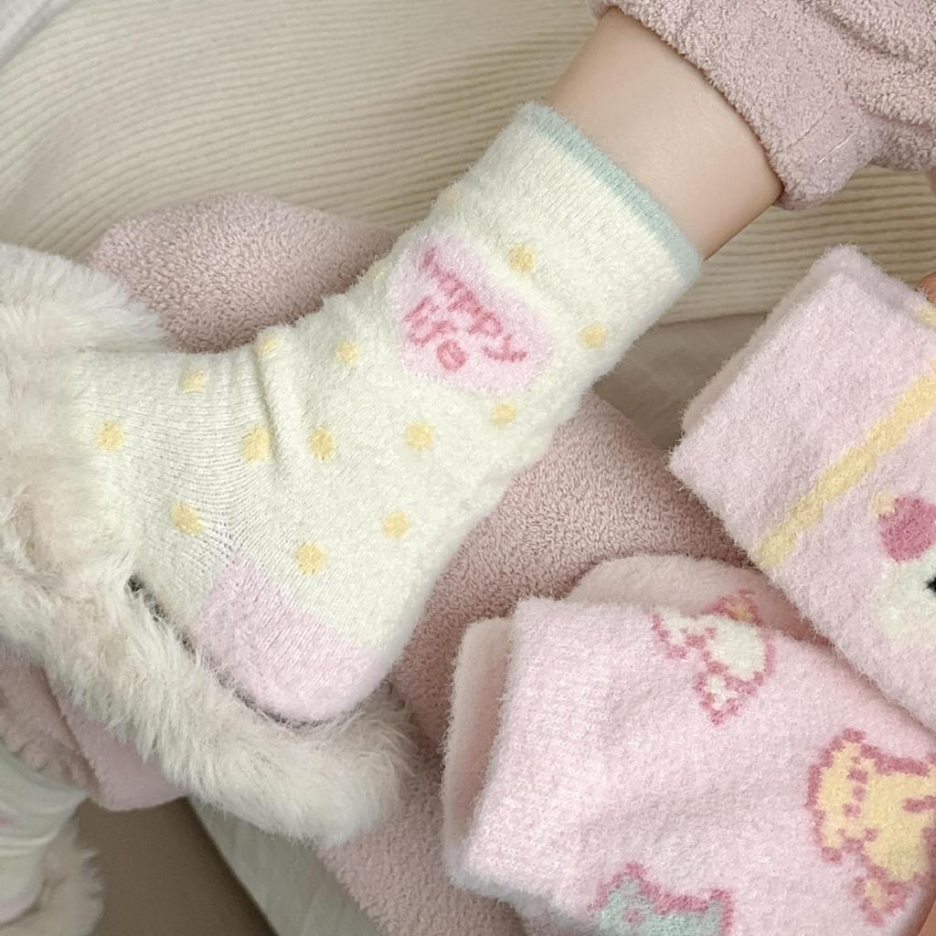 Pink Australian Velvet Socks Thickened Warm Medium Tube Socks Cartoon Striped Cute Plush Floor Socks Women