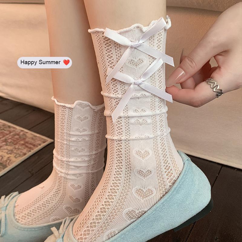 Boots Are Still Cotton, Thin Lolita Lace Stacked Socks, Side Love Bow, Ballet Style Carved Air Tube