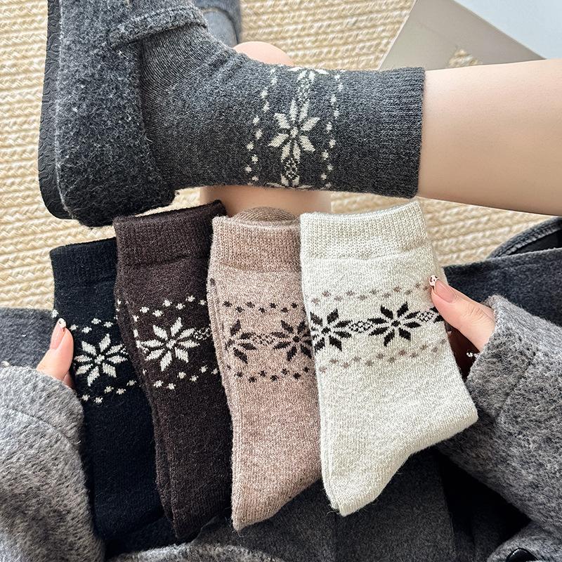 Wool Socks Children'S Season Mid-Tube Socks Trendy Retro Snowflake Fleece Thickened Warm Cashmere Stacking Socks Women