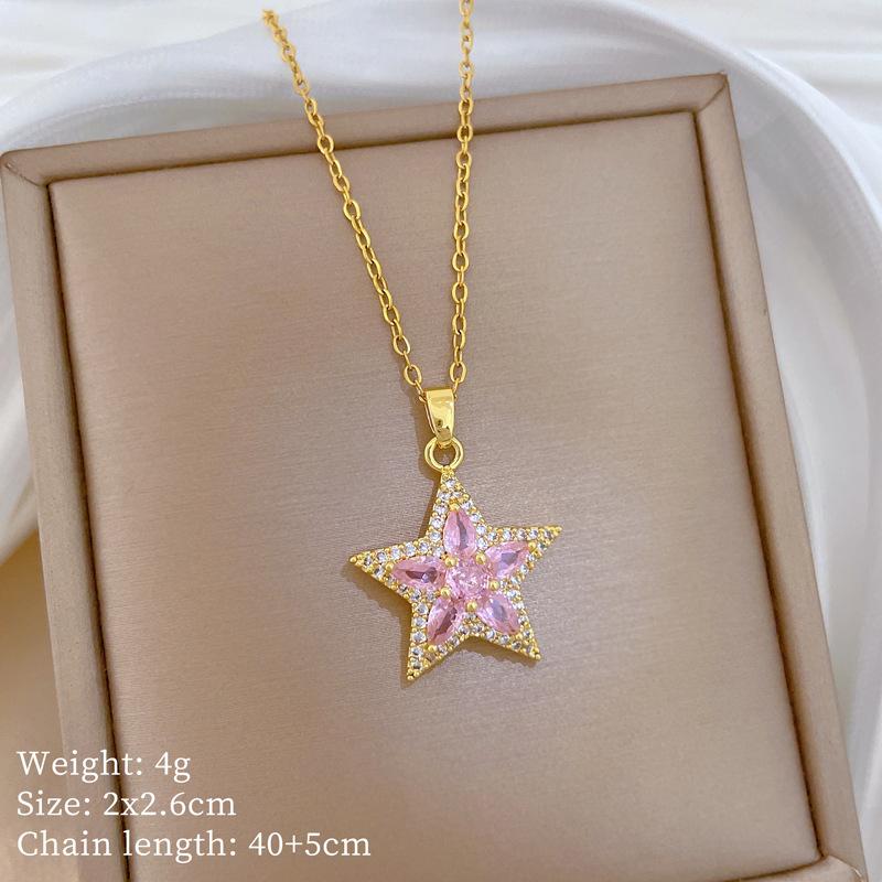 Titanium Steel, Pink Pentagram Light Luxury Temperament Gorgeous Full Diamond Necklace Female Versatile Collarbone Chain Titanium Steel Chain
