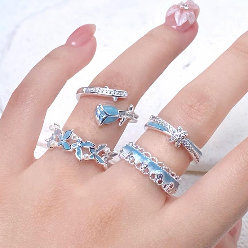 Small Fresh Sea Blue Enamel Dripping Oil Flower Butterfly Opening Ring Niche Light Luxury High-End Ring