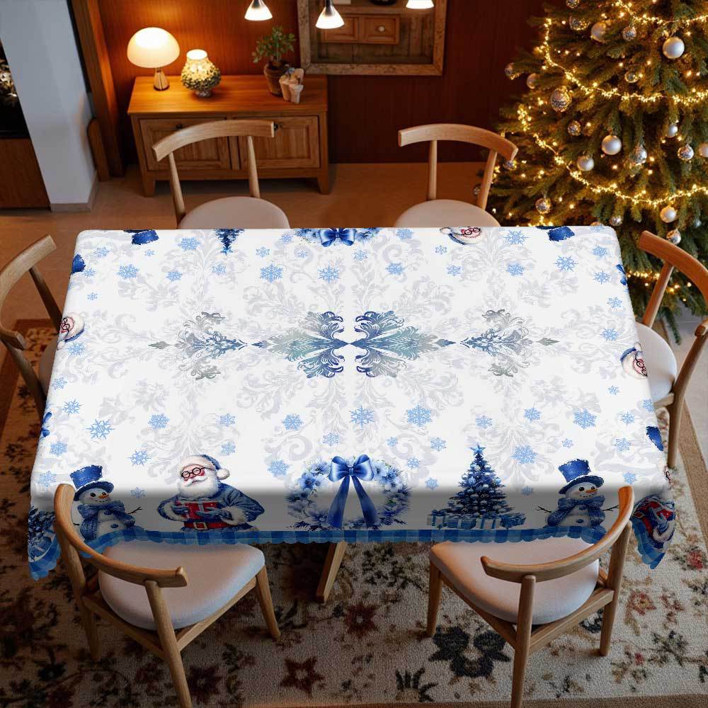 Christmas Tablecloth, Blue And White Cartoon Print Rectangular Table Cloth, Snowman Santa Tablecloth