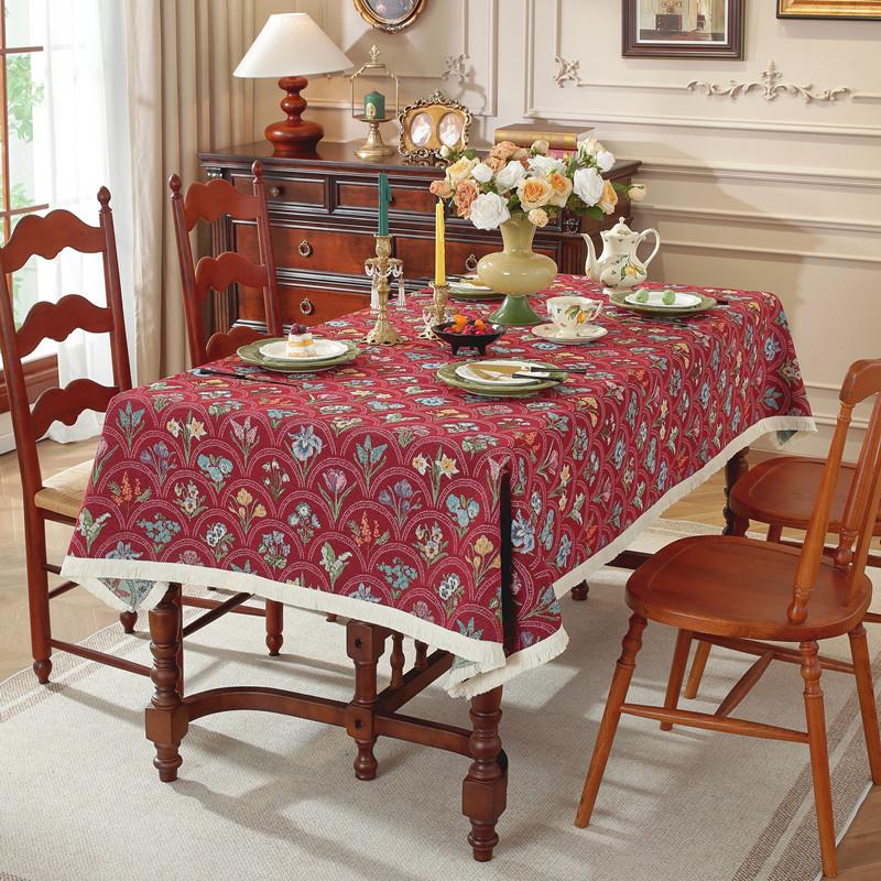 Retro Polyester Cotton Color Woven Jacquard Plant Fan-Shaped Flower Fringed Tablecloth Rectangular Coffee Table Tablecloth Dining Table Cloth
