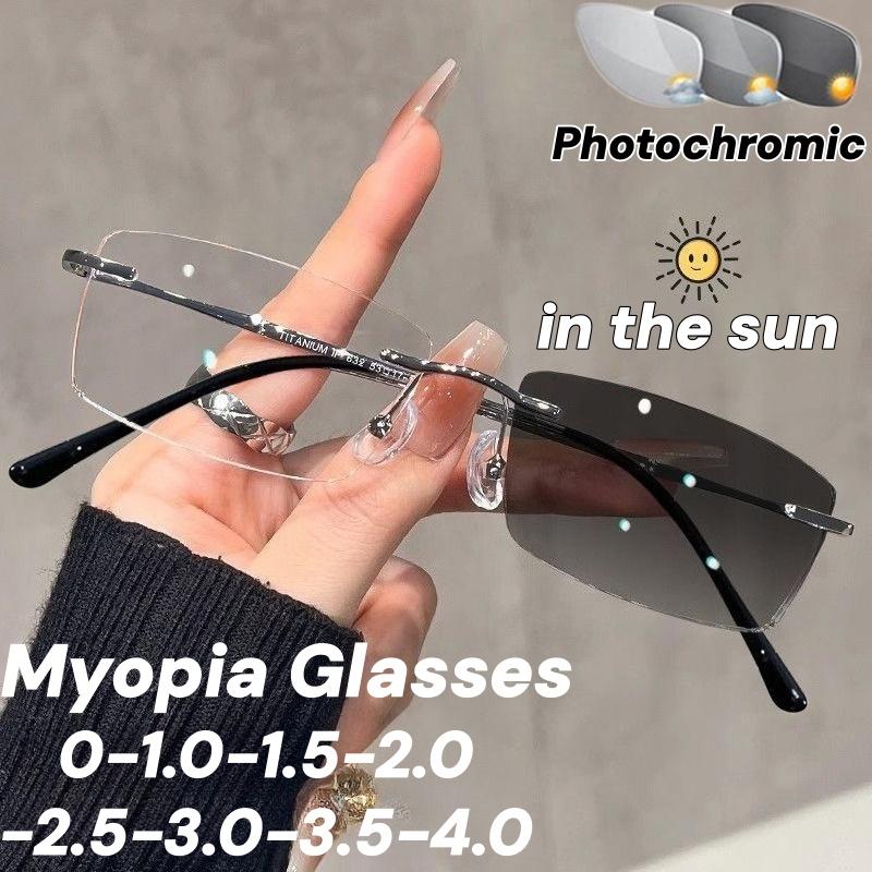 Ultra Light Frameless Color Changing Myopia Glasses for Women Men Temperament Anti Blue Light Photochromic Near Sight Eyeglasses