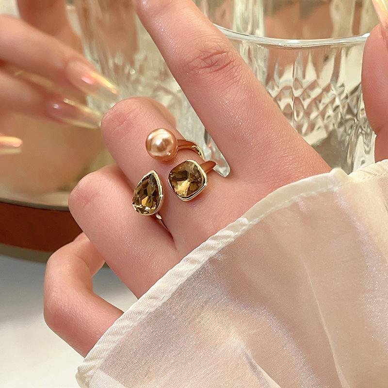 Vintage Luxury Geometry Crystal Champagne Pearl Metal Open Rings Jewelry Party Women'S Exquisite Accessories