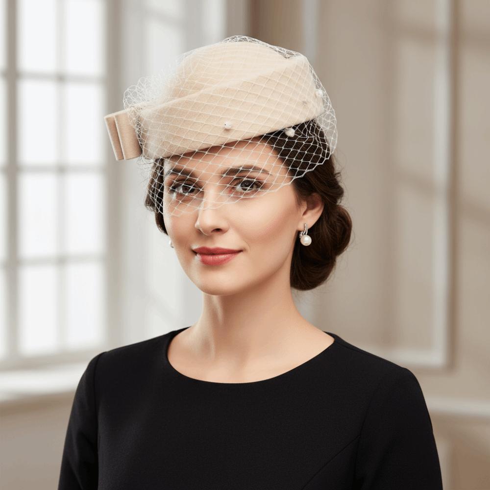 British Style Pillbox Hat Solid Color Topper Hat Elegant Wool Bow Hat with Veil Wedding